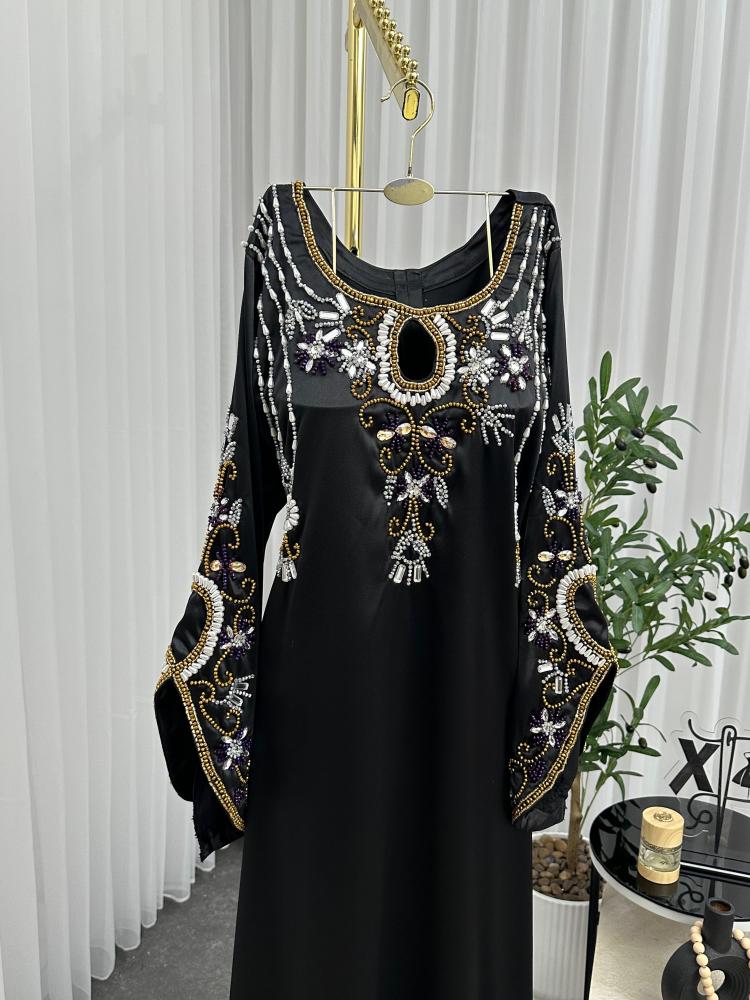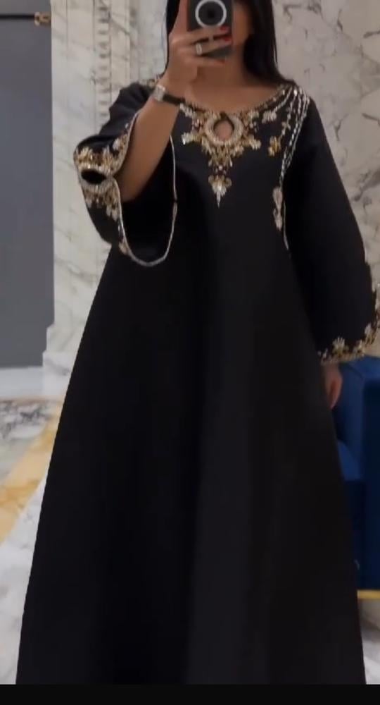اسمن فخامه النور الجلابية في الصورة تتميز بتصميم فاخر وأنيق يجمع بين اللون الأسود الكلاسيكي والتطريزات الفخمة.
